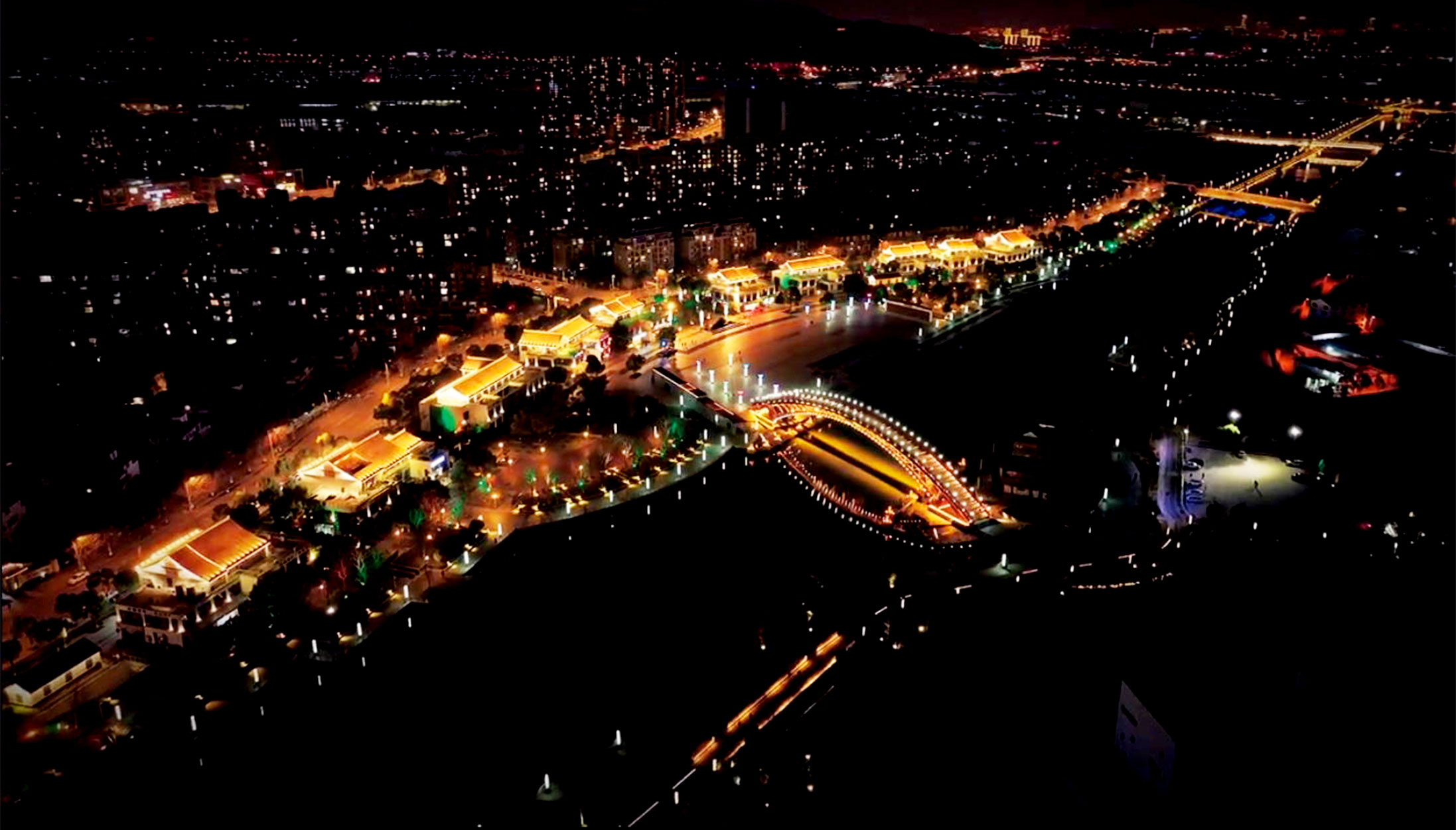 “根据一箭河两岸实景深化驳岸、亲水平台灯光设计,为居民夜间游览营造了舒适的氛围感”···
